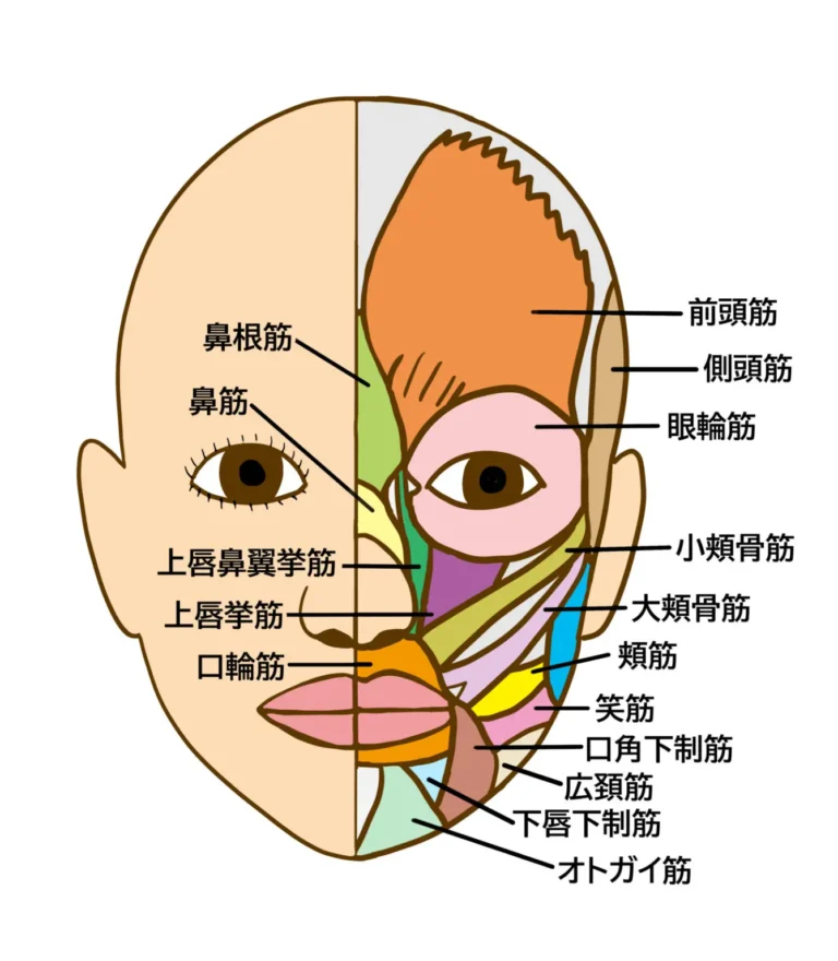 主に口周りの筋肉に集中していて口角の上下運動や、斜めに引き上げたりなどの動きを助けてくれます。