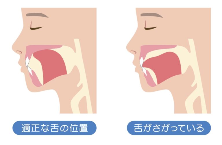 舌が沈下して口腔内空間が狭くなると、口呼吸になりやすくなります。口呼吸は「顔が縦長」だったり、「顔がたるみやすい」などの骨格変化を促すと言われています。