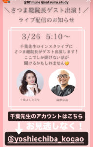 5:10〜 総院長が千葉先生のインスタライブにゲスト出演いたします。