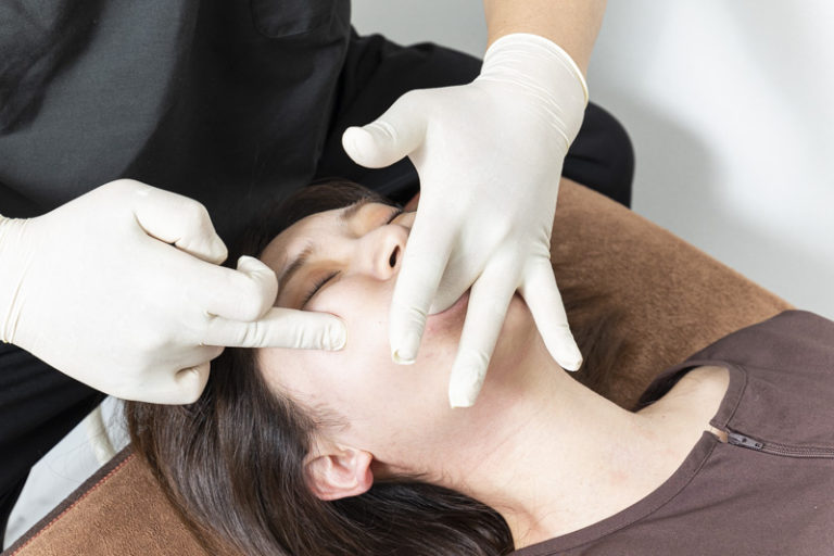 上顎牽引は下顎牽引と頚部のストレッチは同じにはなりますが、顔の立体感を出させる様にアプローチをしていきます。